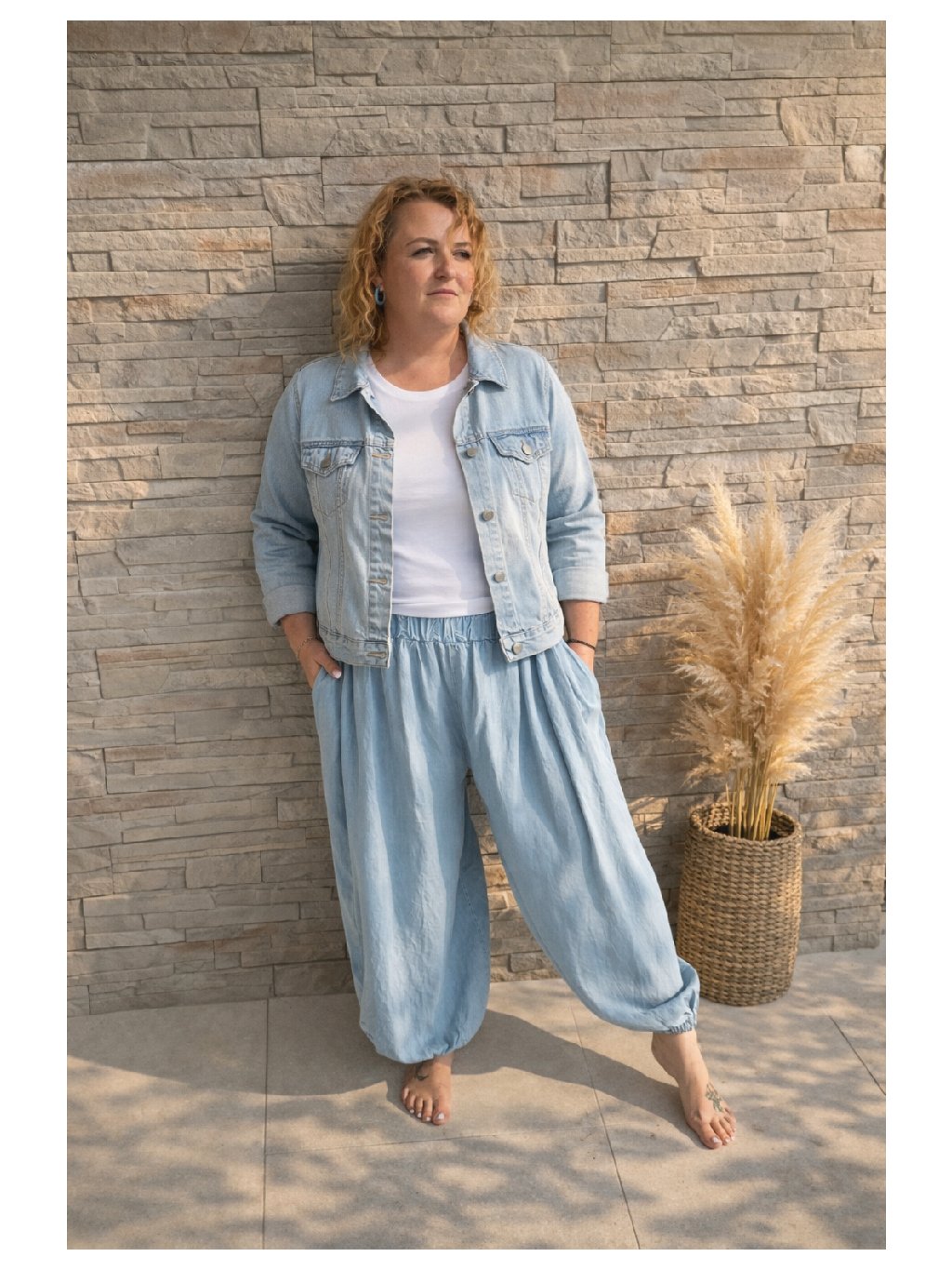 V pase mají pružnou gumu, která se snadno přizpůsobí postavě a zajišťuje pohodlné nošení bez škrcení. Nohavice jsou zakončené také na gumu, což vytváří typický „balónový“ efekt a zároveň drží tvar kalhot. Materiál působí lehce a vzdušně, ideální pro teplejší dny nebo ležérní, stylové outfity.