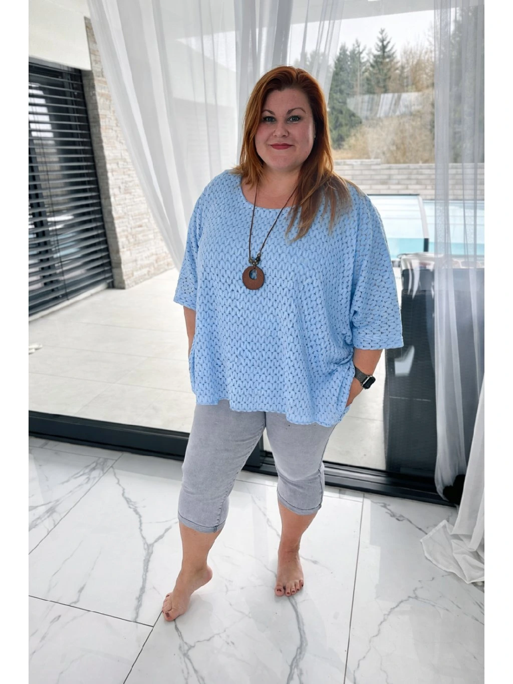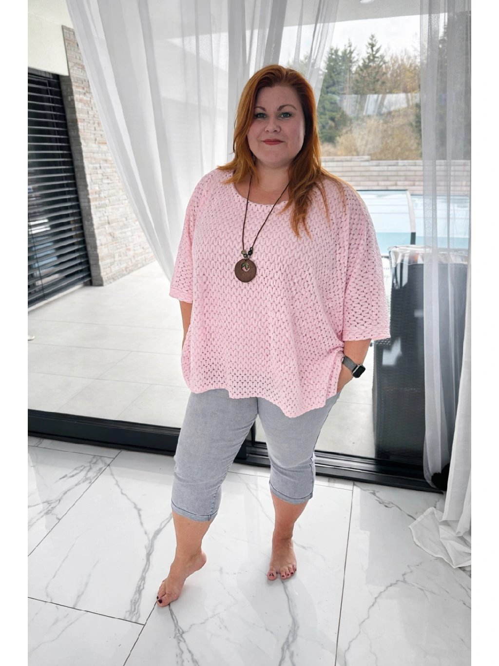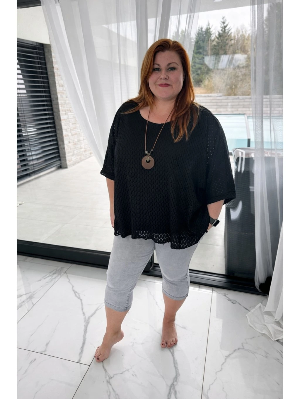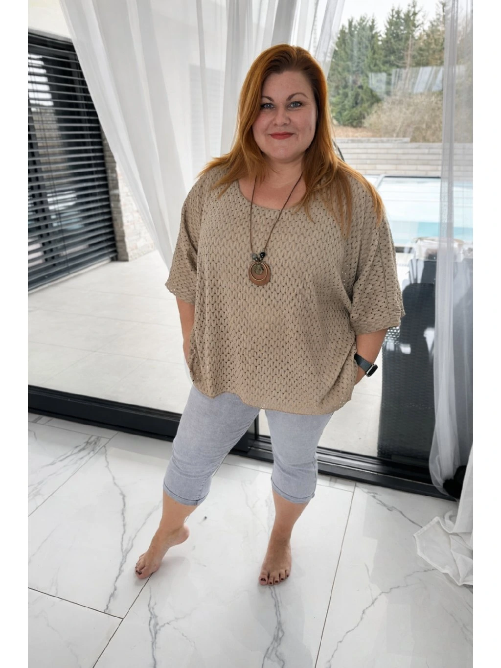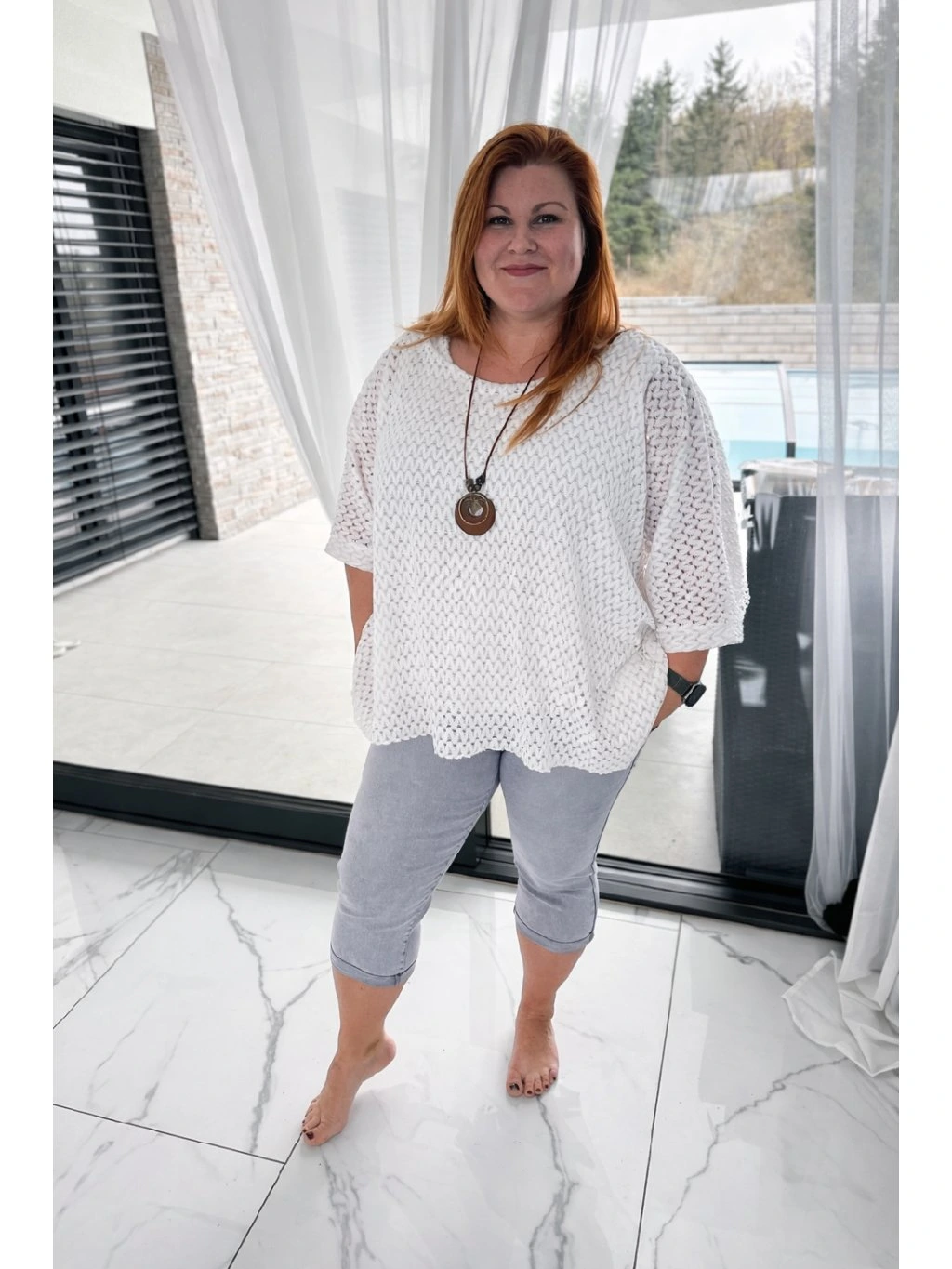 Celkový outfit elegantně doplňuje dlouhý náhrdelník, který přidává výrazný módní akcent a podtrhuje ženský charakter halenky. Kombinace jemného háčkovaného designu a nápaditého šperku vytváří harmonický celek vhodný jak pro každodenní nošení, tak i pro stylovější příležitosti.