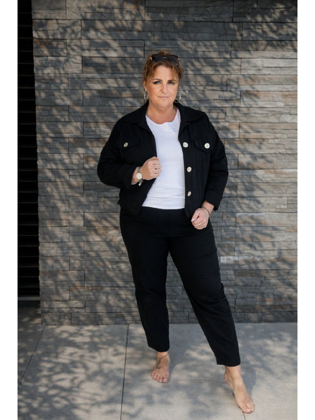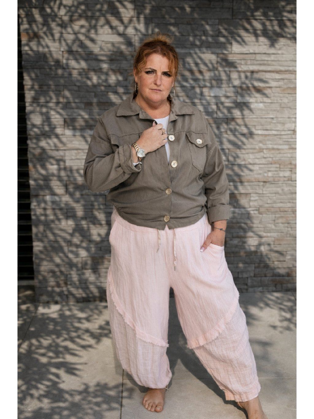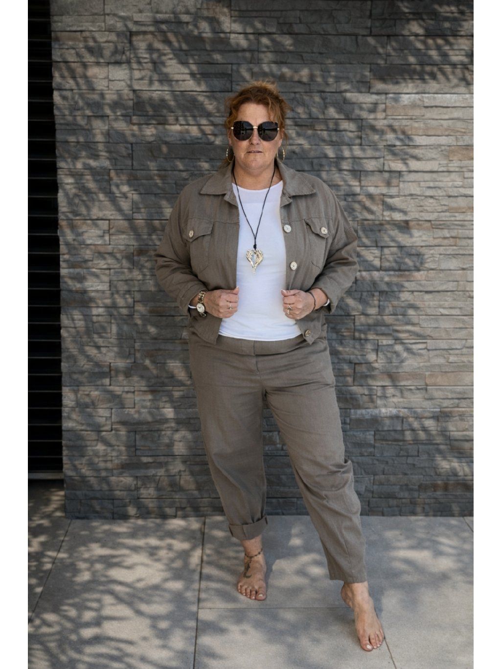 Horní díl představuje lehká bundička či košile s dlouhým rukávem. Zaujme především výraznými knoflíky, které tvoří zajímavý designový prvek a dodávají celému kompletu osobitý styl. Tento komplet je ideální volbou pro každodenní nošení i neformální příležitosti, kdy chcete spojit pohodlí s moderním vzhledem.