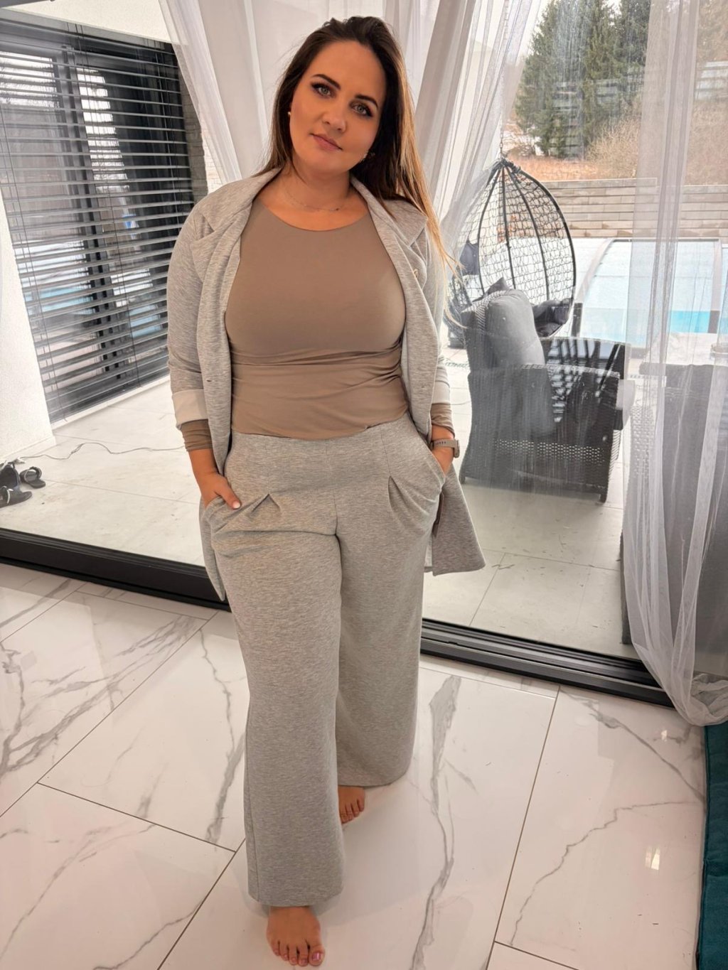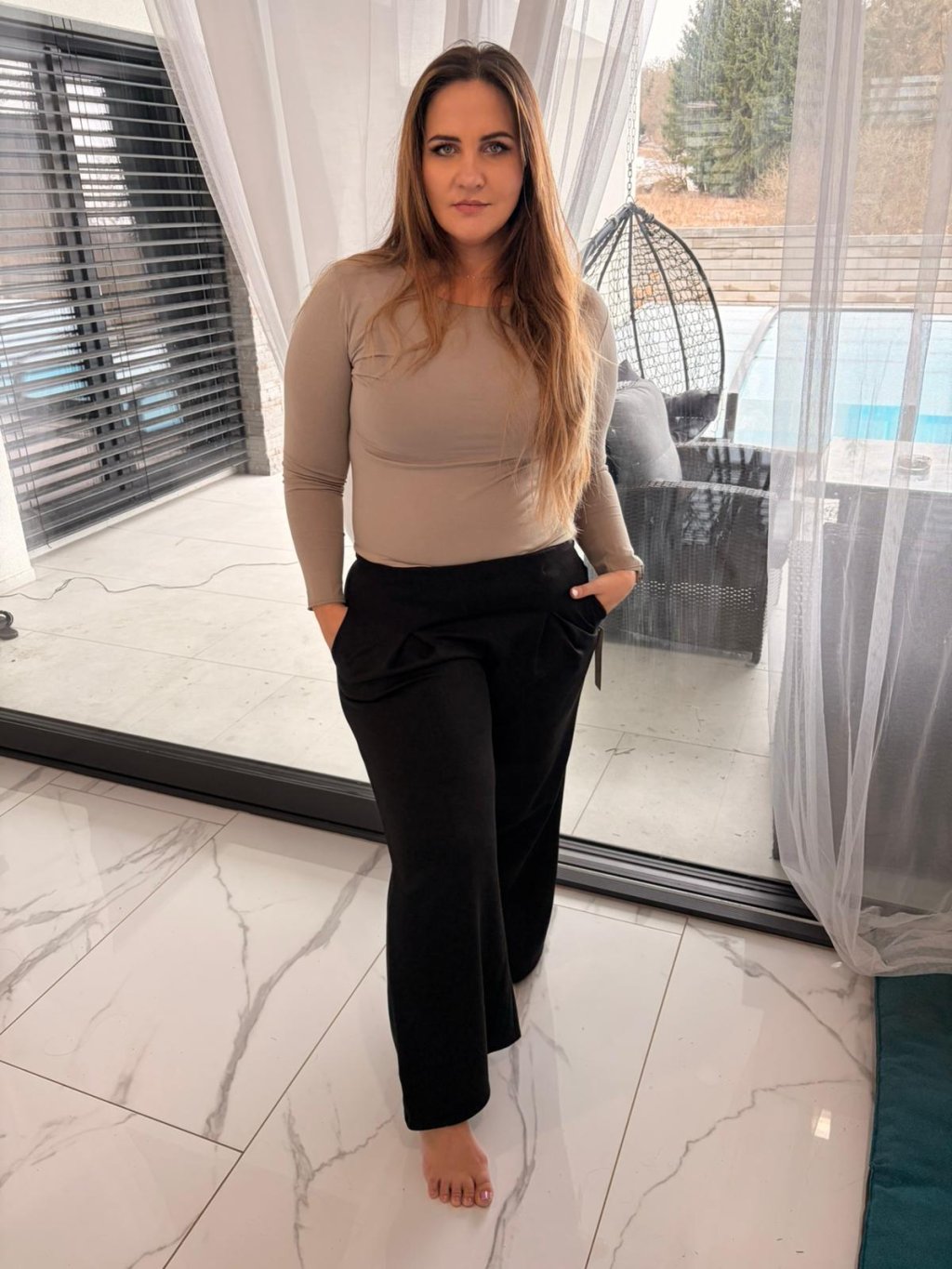 kalhoty v pase na pružnou širší gumu se sámky pod pasem, rovný střich, široké nohavice - opravdu skvělá kombinace elegance a pohodlí a unosit je můžete úplně všude. Skvěle padnou k tričkům
