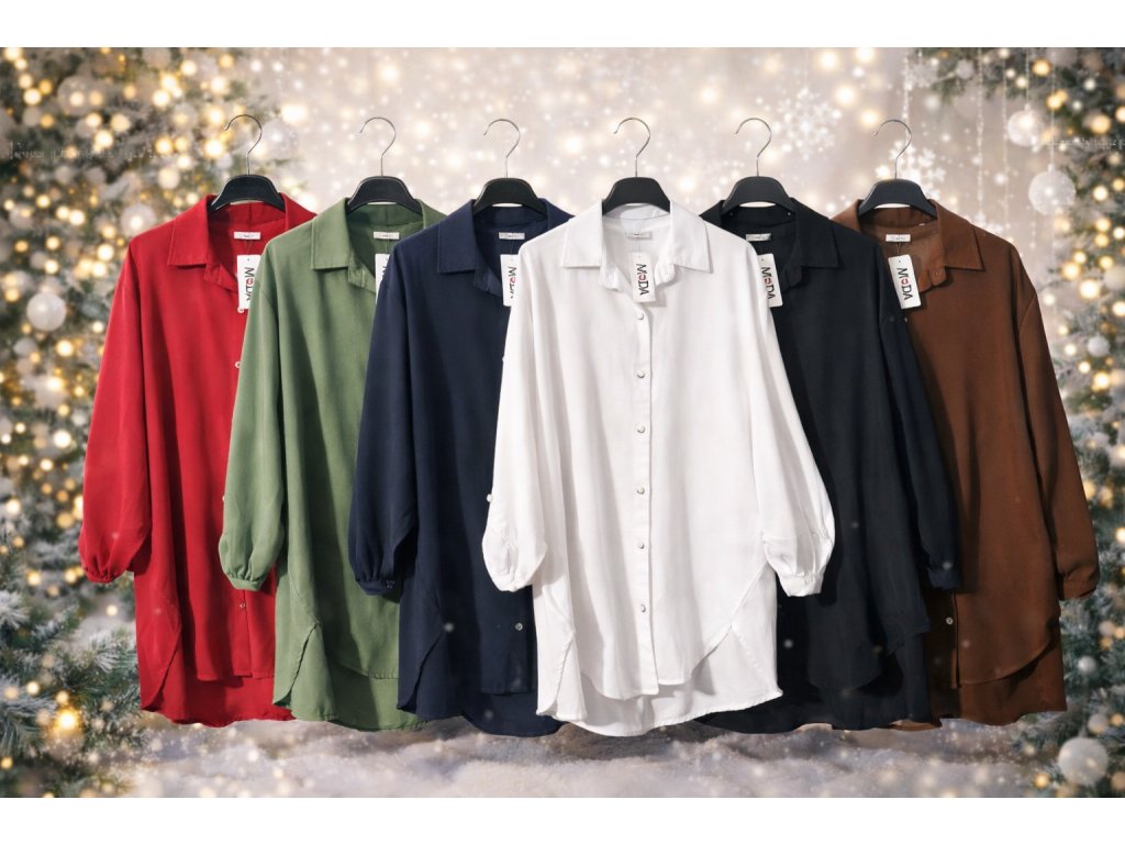 Delší zadní díl: zadní část je delší než přední s mírným zaoblením (tzv. „tail-hem“), což přidává zajímavý vizuální detail a dělá košili univerzální k vrstvení.