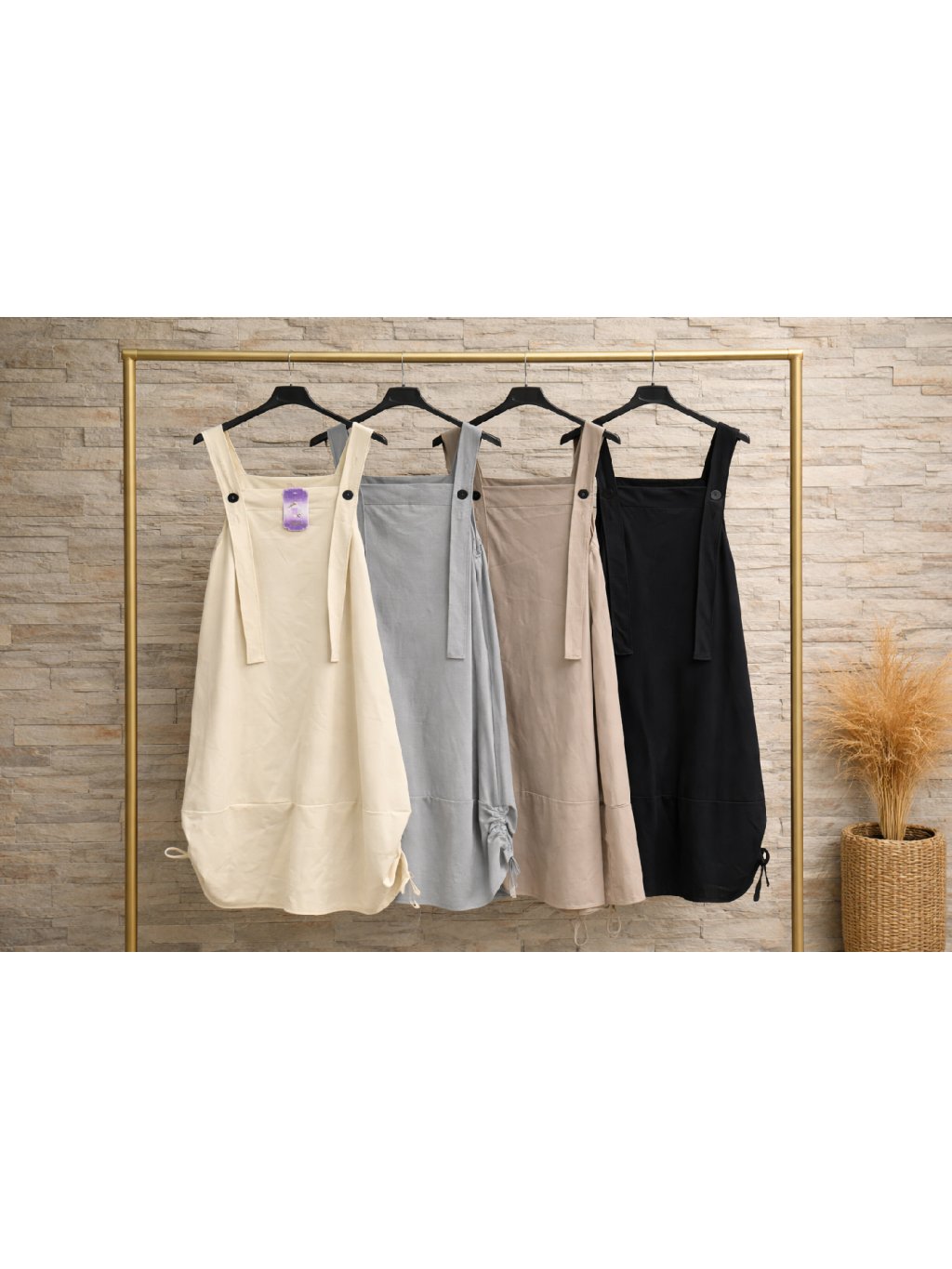 Horní část tvoří lacl se zapínáním na knoflíky, které nejen dobře drží, ale zároveň slouží jako výrazný designový prvek. Po stranách šatů jsou umístěné šňůrky na stažení, díky nimž si lze jednoduše upravit siluetu podle potřeby.