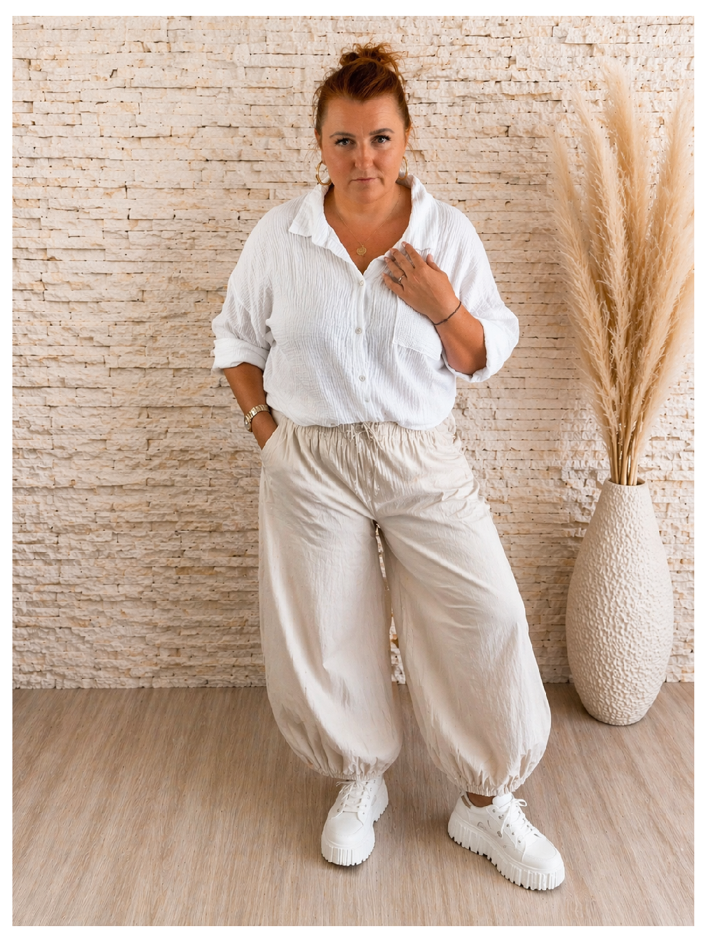 Střih bývá volnější, s klasickým límečkem a zapínáním na knoflíky, což umožňuje variabilní styling – od upravenějšího vzhledu až po uvolněné nošení rozepnuté přes top.