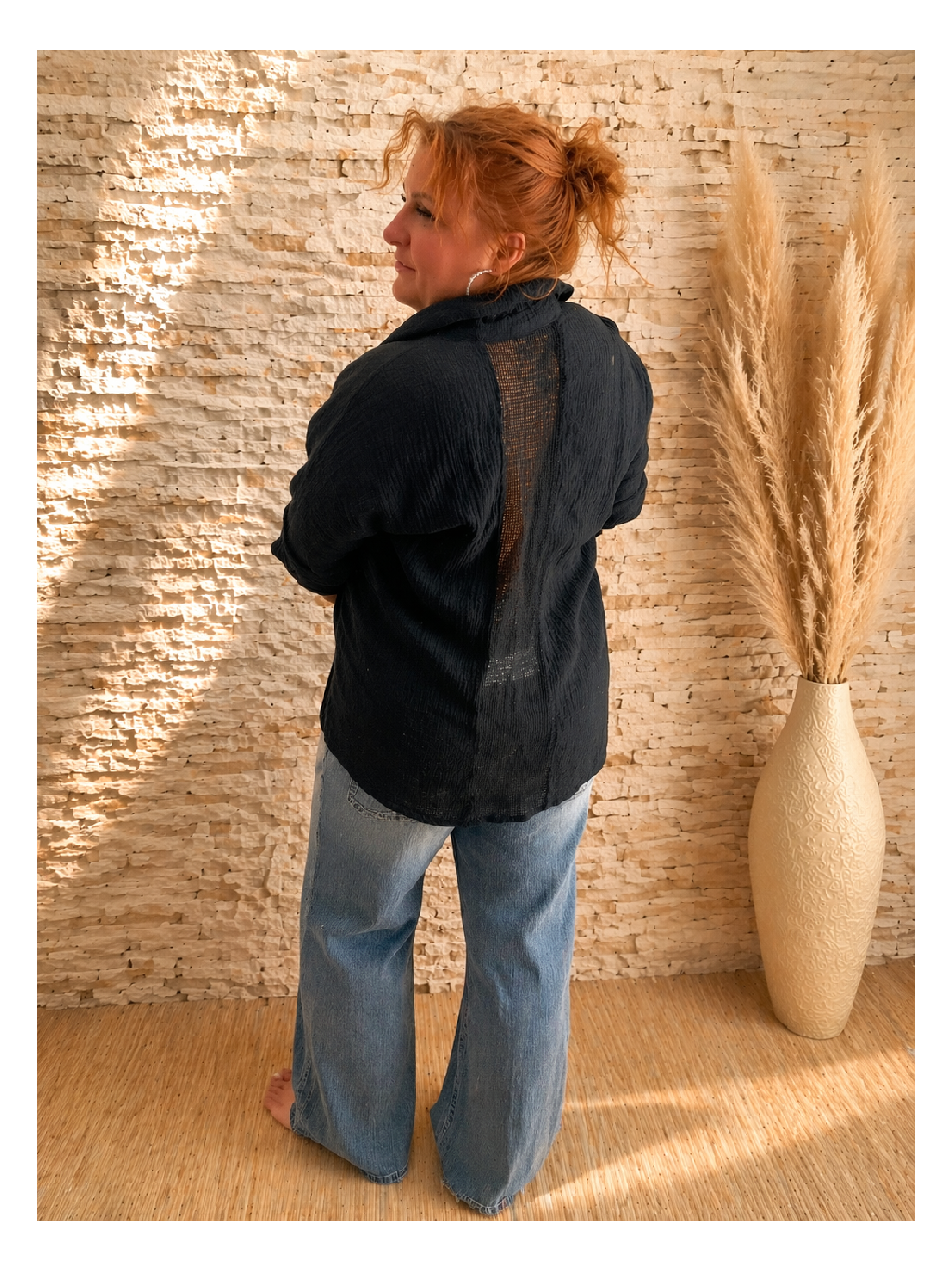 Zajímavým detailem je síťovaná vsadka na zádech, která dodává košili subtilní průsvitnost a zároveň zvyšuje její vzdušnost. Tento prvek působí moderně a nenápadně oživuje jinak jednoduchý střih.