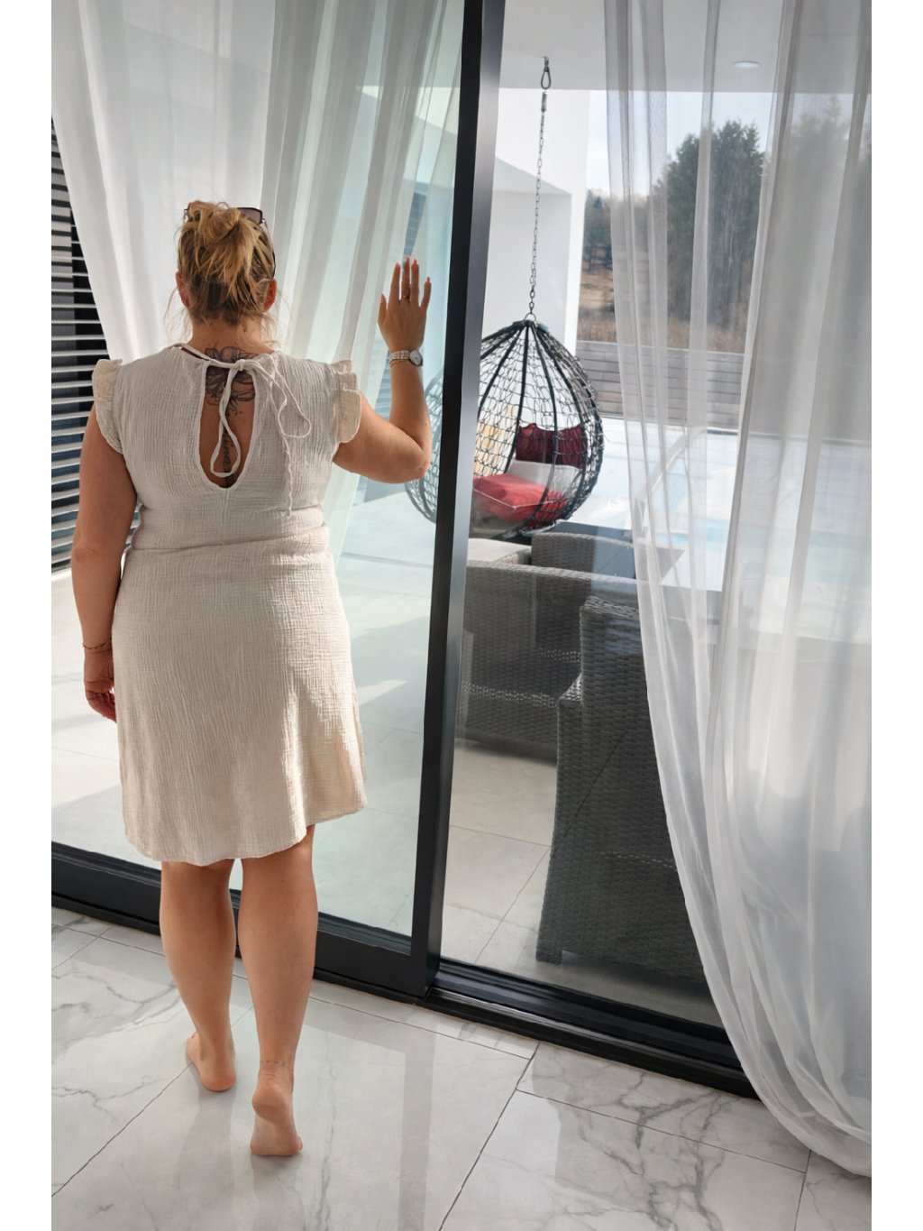 Krátké šaty z jemného mušelínu mají volnější, splývavý střih, který krásně kopíruje pohyb těla. Horní část tvoří hlubší výstřih do V, který opticky prodlužuje krk a zvýrazňuje dekolt. Pod prsy jsou šaty přestřižené, což vytváří zvýšený pas – tento střih zvýrazňuje poprsí a zároveň nechává sukni volně padat. Spodní část je lehce nabíraná, díky čemuž šaty působí vzdušně a romanticky. Krátká délka sahá přibližně do poloviny stehen a dodává modelu svěží letní charakter.