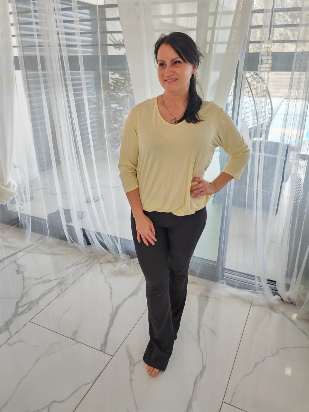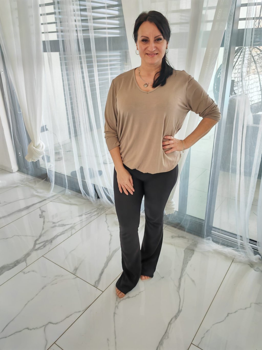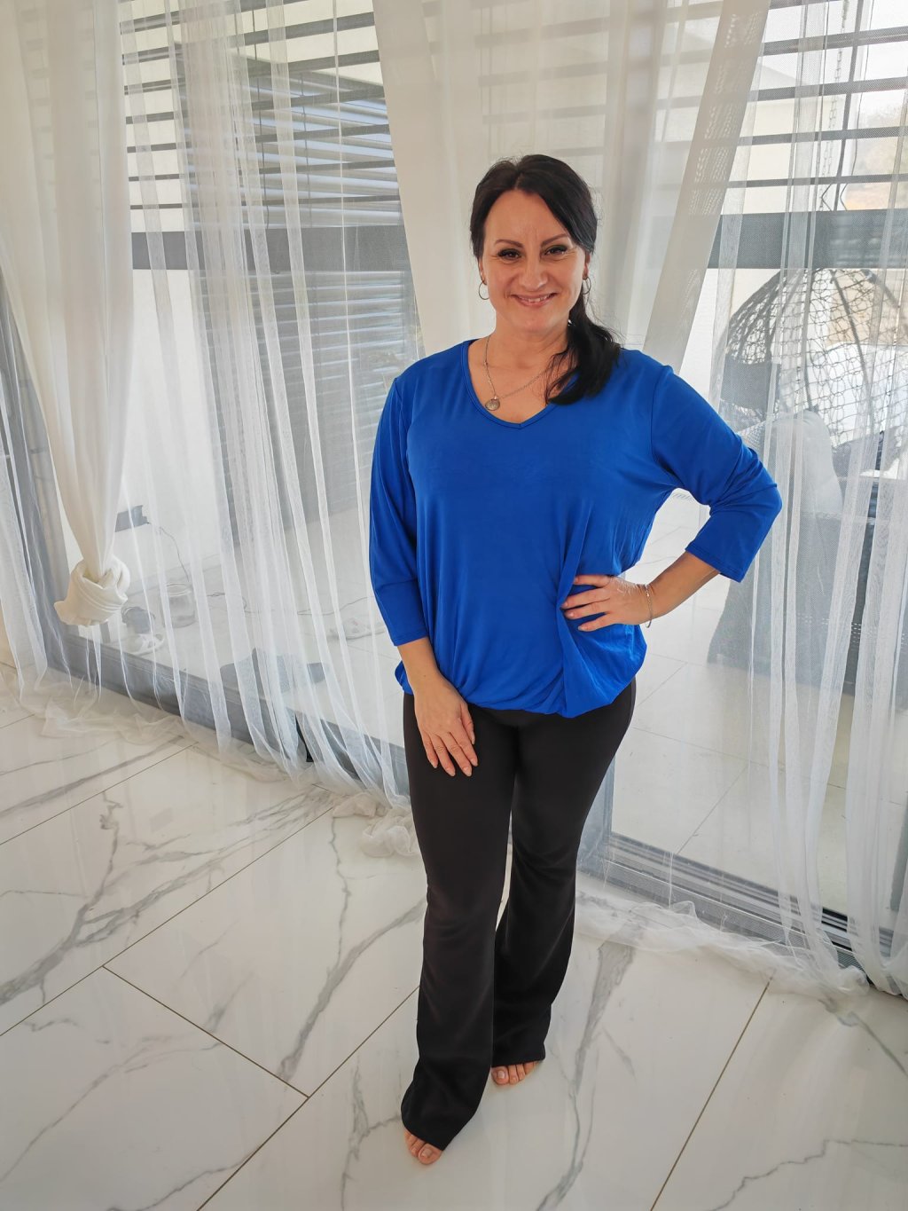 Trika s výstřihem do V, s tříčtvrtečním rukávem a v dolní části na pružnou gumu. Triko lze nosit vykasané nebo spuštěné, záleží jen a jen na vás. Lze kombinovat s tepláky či legínami.