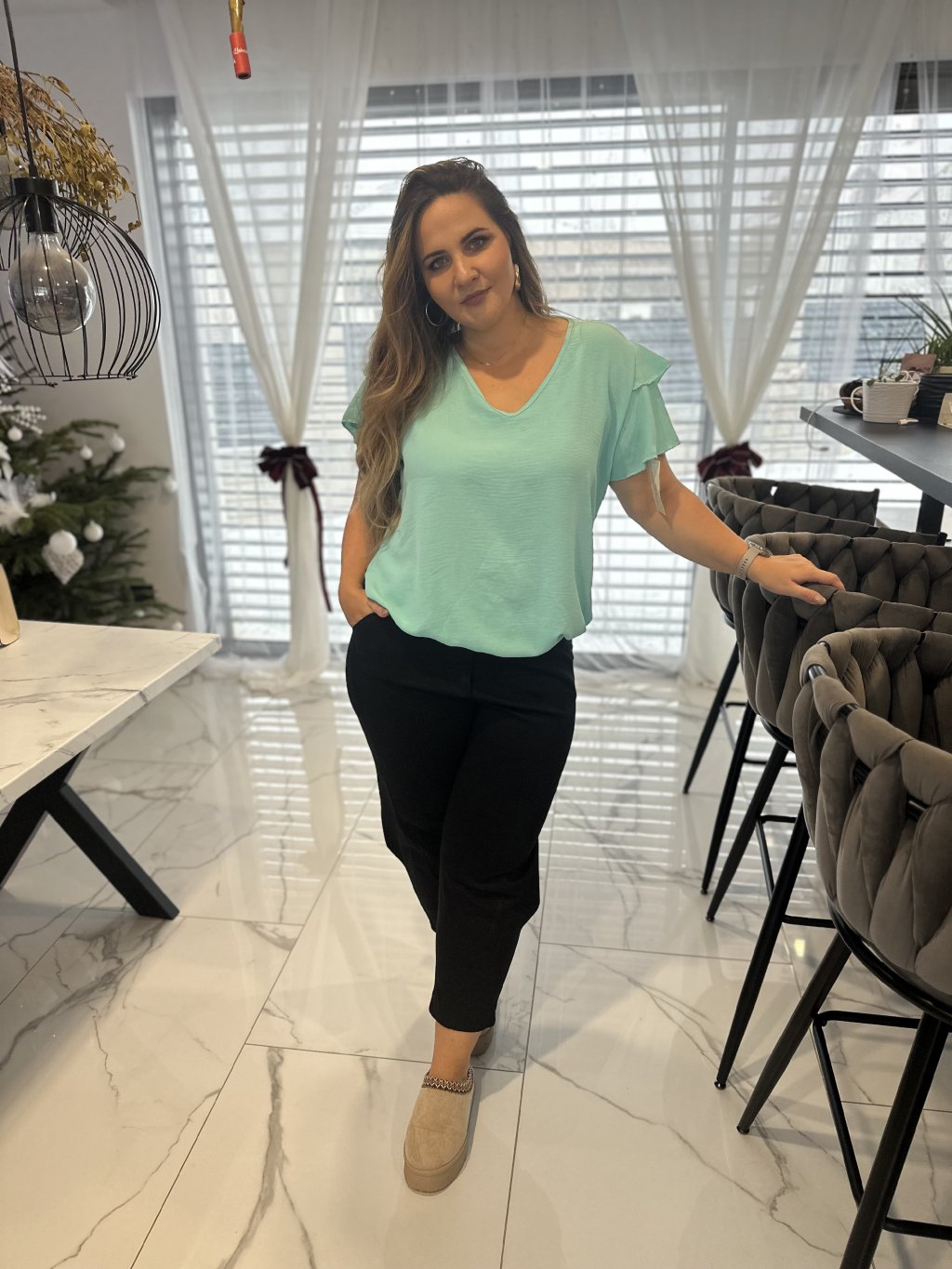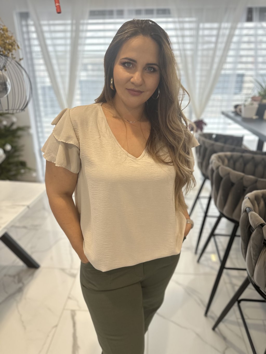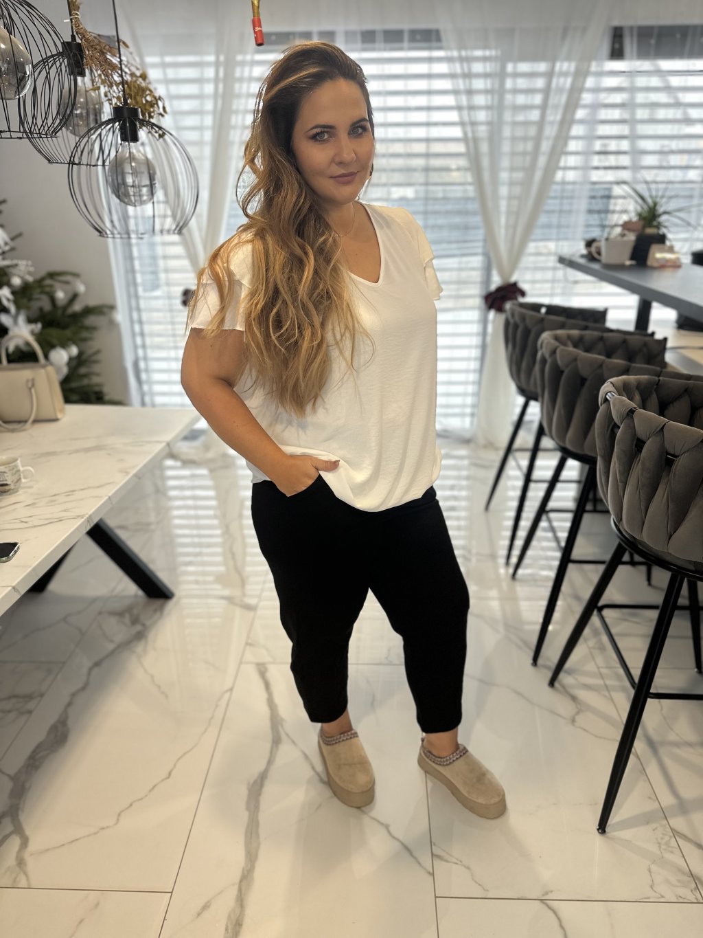 Tričko má elegantní výstřih do V, který lichotí dekoltu a působí žensky. Velmi oblíbeným detailem je guma ve spodní části, díky které si tričko krásně zregulujete podle potřeby – můžete ho nosit volně nebo lehce podkasat.
