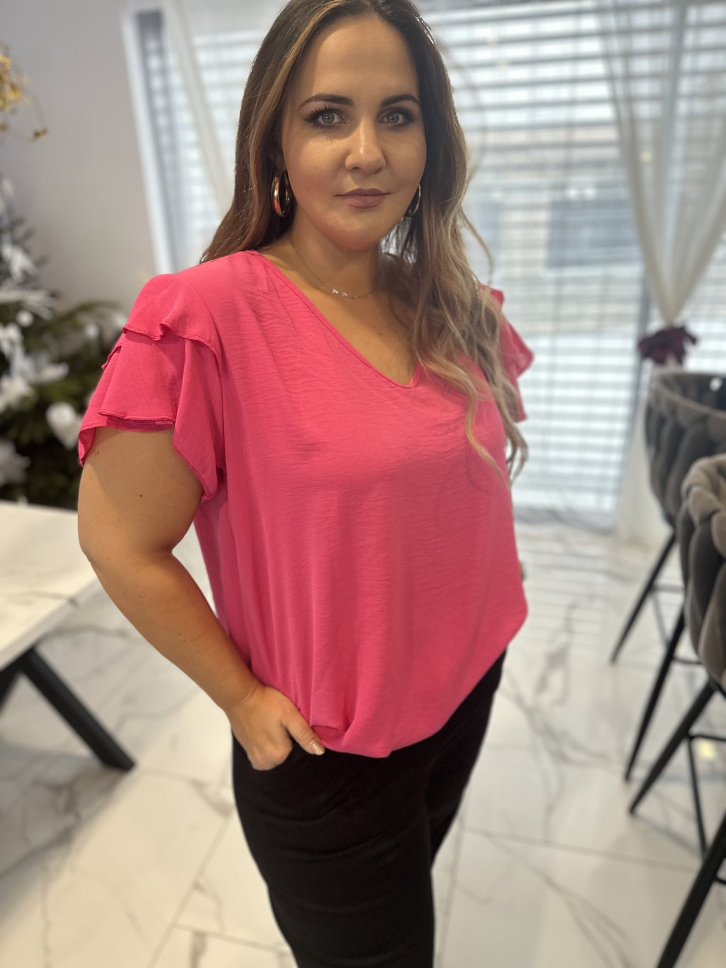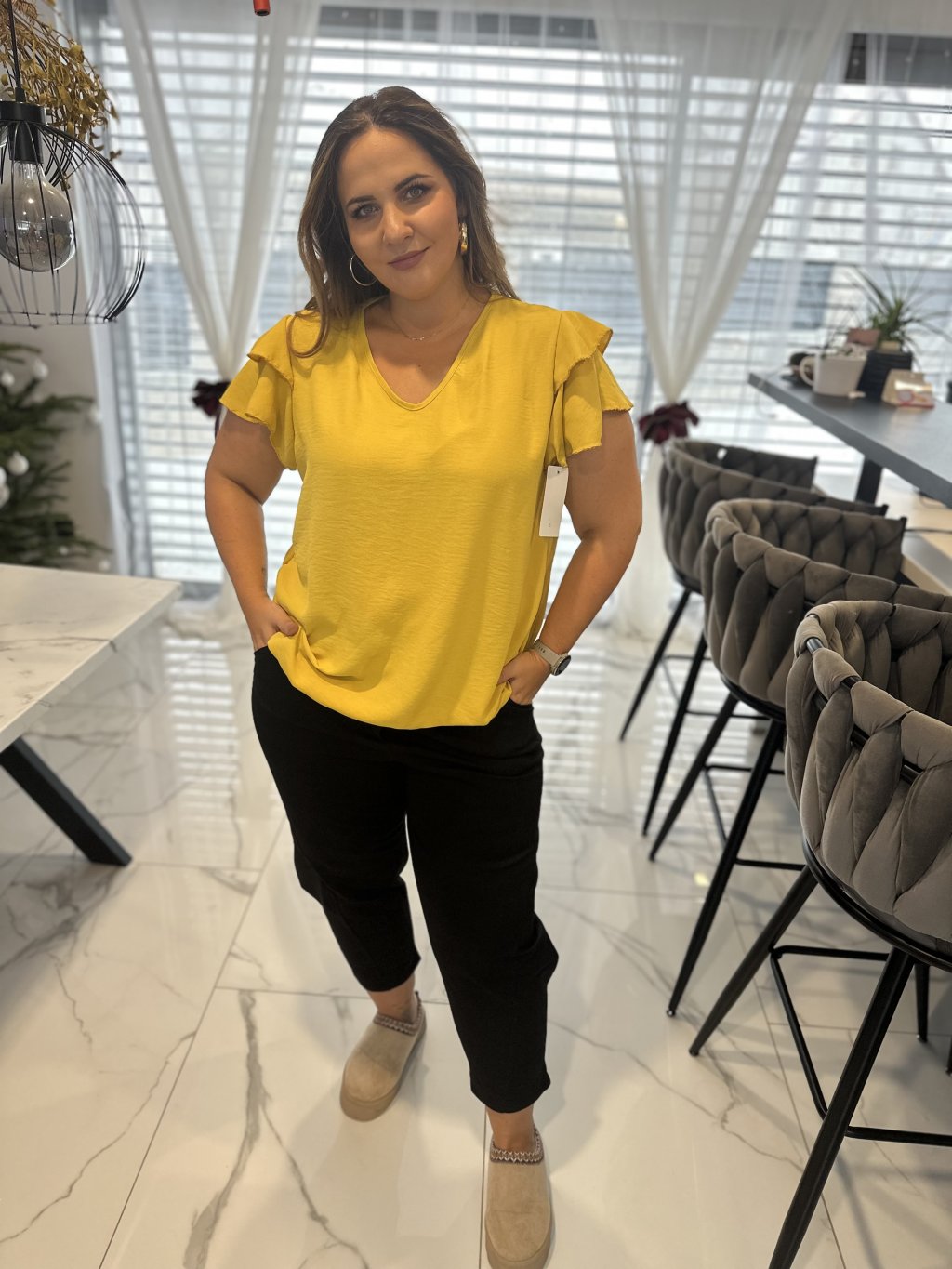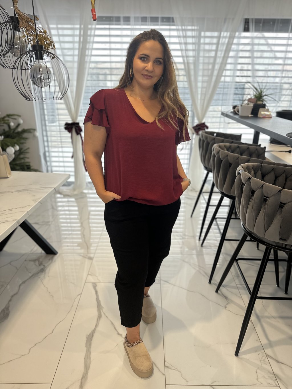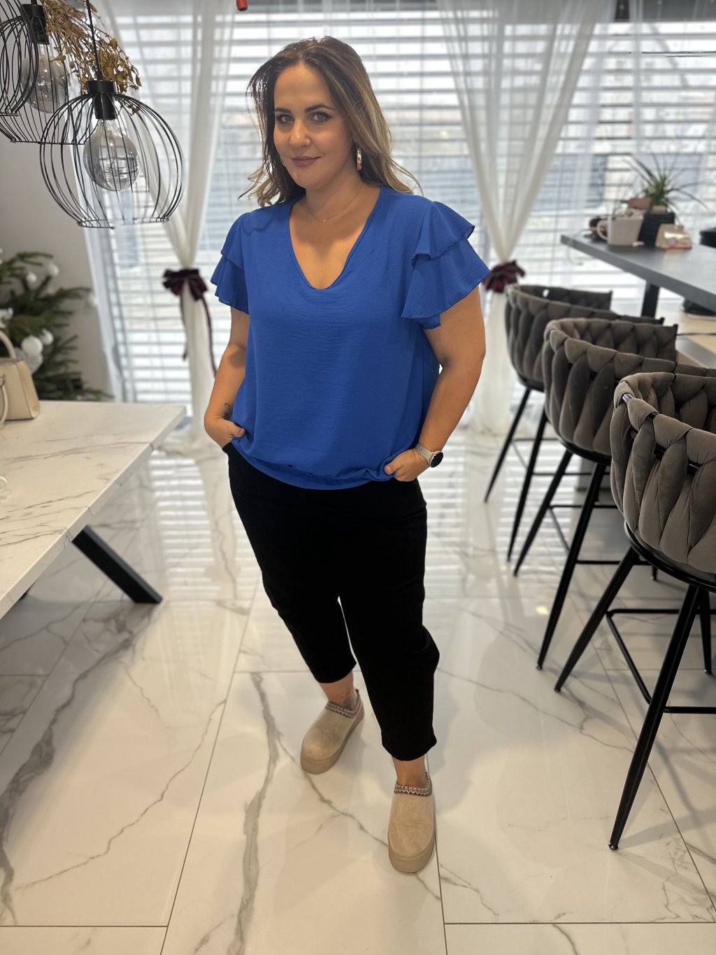 Tričko má elegantní výstřih do V, který lichotí dekoltu a působí žensky. Velmi oblíbeným detailem je guma ve spodní části, díky které si tričko krásně zregulujete podle potřeby – můžete ho nosit volně nebo lehce podkasat.